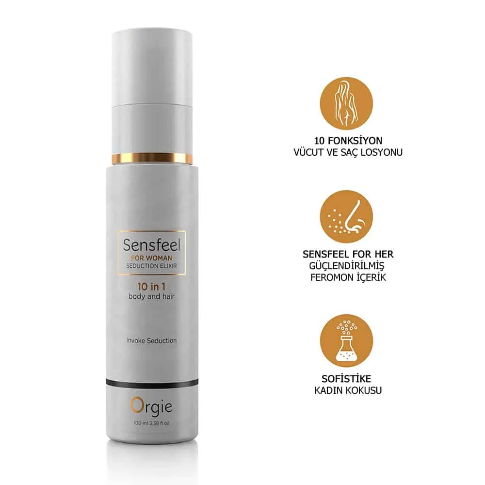 Sensfeel Seduction Elixir 10’u 1 arada feromonlu vücut ve saç losyonu. 10 fonksiyonunda etkilidir: